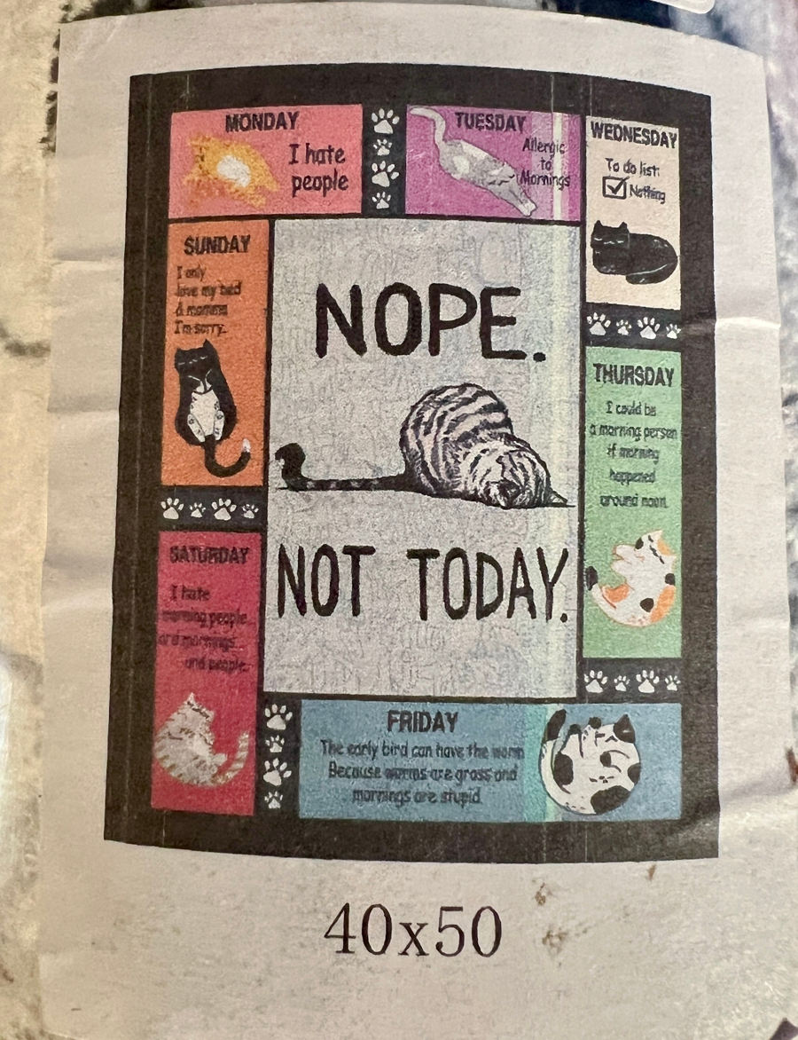 • 40” x 50” “Nope, Not Today” cat-themed blanket