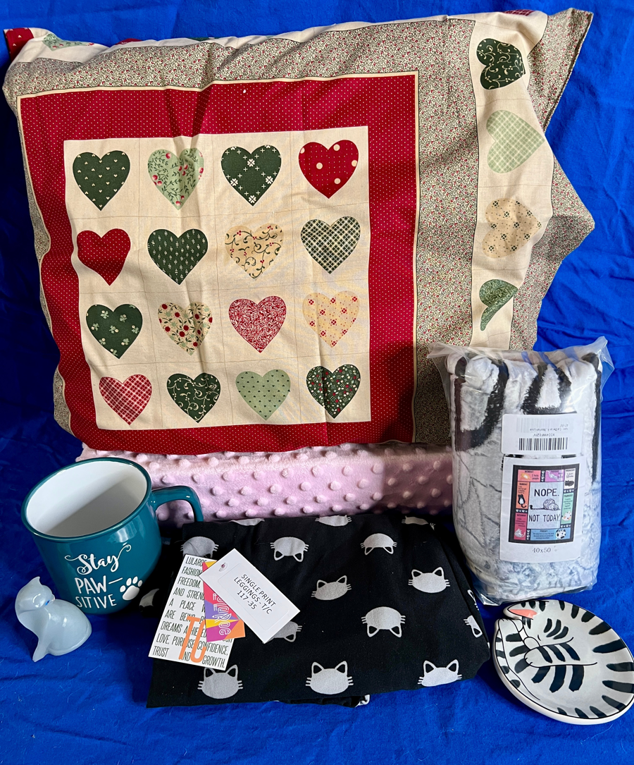 To top it off, this bundle includes a pair of Lula Roe comfy cat-themed leggings (Size TC) and a beautifully handmade heart pillow crafted by Alana O’Kelly, complete with a removable insert for easy washing. It’s the perfect mix of cozy comfort and cat-loving personality from head to toe (and couch to coffee cup!).