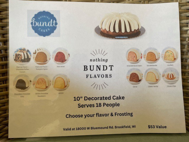 Everyone loves "Nothing Bundt Cakes!" Certificate is for a 10" Decorated Cake of your choice. Great for birthday or holiday party. Serves 18 people. Choose your flavor and frosting preference along with decorations. Valid at -Nothing Bundt Cakes, 18000 W. Bluemound Rd. Brookfield, WI 53045. Used for cake purchases only. Expires 6/1/2026