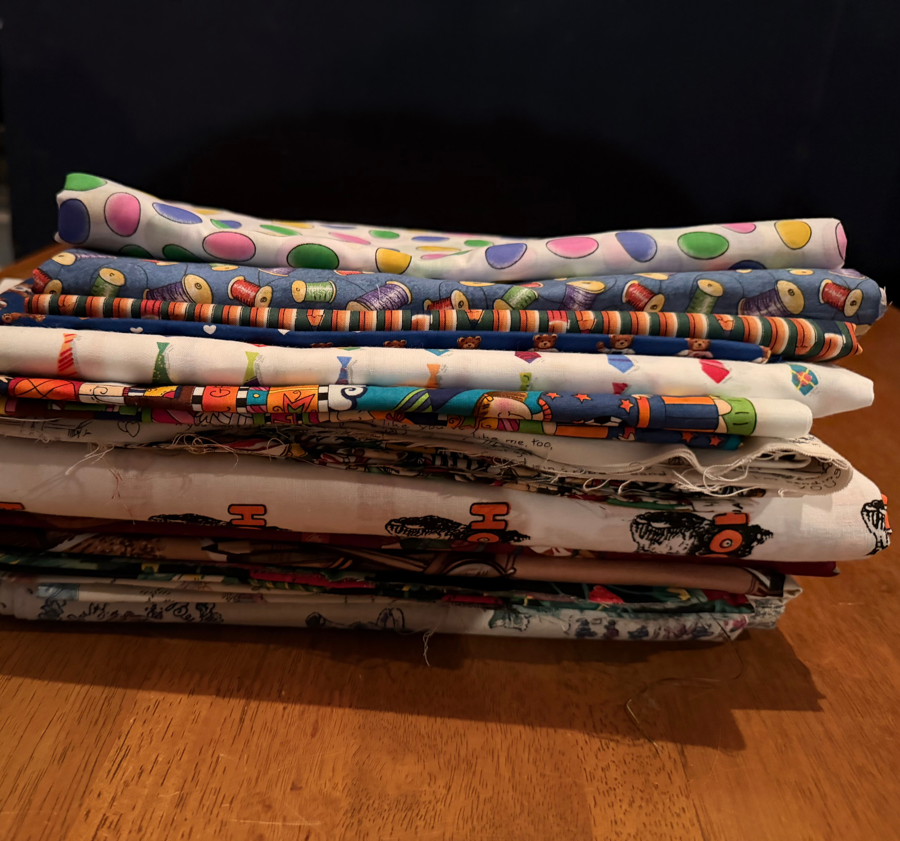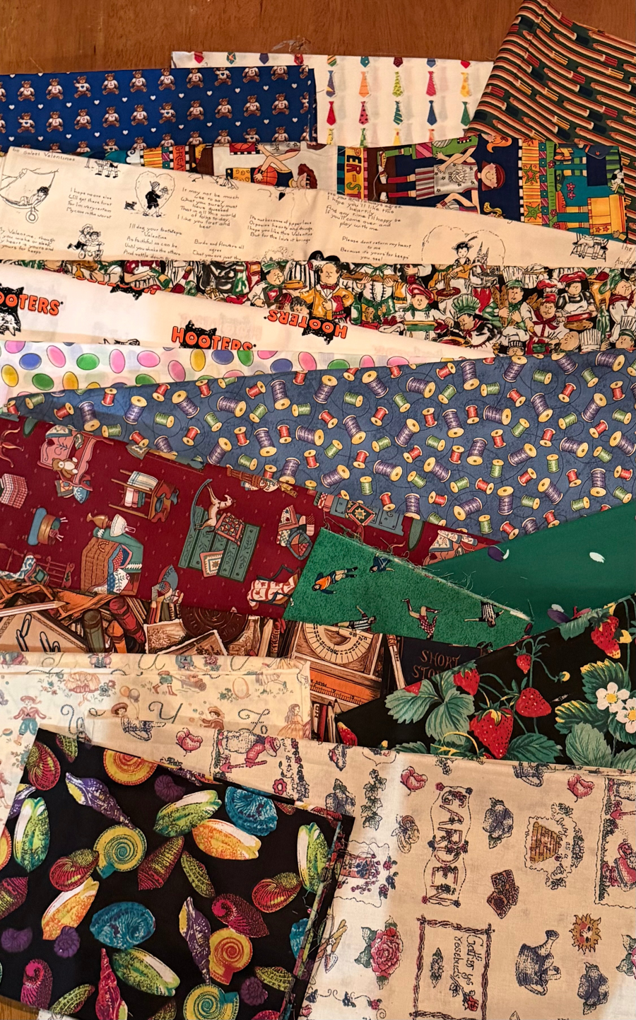 Novelty 2 (19 different fabrics including 3 yard piece) Multiple pieces of fabric. No guarantees for sizes (all sizes are estimates)