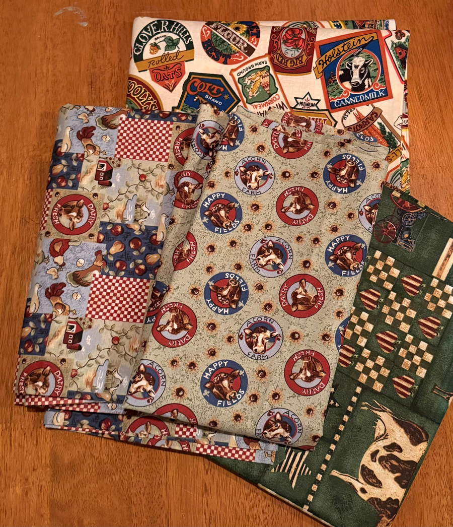 Novelty 6 (14 different fabrics including 2 yard pieces) Multiple pieces of fabric. No guarantees for sizes (all sizes are estimates)