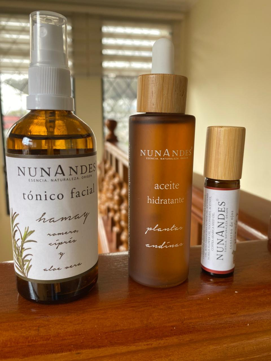 🌿 Nunandes Facial Care Kit Description. This set is composed of three products from the Nunandes line (Esencia, Naturaleza, Origen), all utilizing natural ingredients, including Andean plants. 1. Hamay Facial Toner Full Name: Hamay Facial Toner Rosemary, Cypress, and Aloe Vera Volume: 100ml Features: A toner designed for the face. Its main ingredients are rosemary (known for its astringent and revitalizing properties), cypress, and aloe vera (excellent for soothing and hydrating the skin). 2. Andean Plants Moisturizing Oil Full Name: Andean Plants Moisturizing Oil Volume: 60ml Features: An oil formulated to provide deep hydration. It is made with a blend of Andean plants, rich in nutrients and antioxidants, which help keep the skin soft, elastic, and nourished. 3. Geranium and Myrrh Eye Contour (Roller) Full Name: Geranium and Myrrh Eye Contour (Roller) Volume: 10ml Features: A specific product for the delicate eye contour area, in a roller format (ball applicator) for easy and refreshing application. It contains geranium and myrrh, oils known for helping to revitalize, reduce puffiness, and smooth fine lines in the eye area. The label also indicates Arabica Coffee Seed Oil (Coffea Arabica Seed Oil) as an ingredient. Español: 🌿 Descripción del Kit de Cuidado Facial Nunandes. Este set está compuesto por tres productos de la línea Nunandes (Esencia, Naturaleza, Origen), que utilizan ingredientes naturales, incluyendo plantas andinas. 1. Tónico Facial Hamay Nombre Completo: Tónico Facial Hamay Romero, Ciprés y Aloe Vera Volumen: 100ml Características: Un tónico diseñado para el rostro. Sus ingredientes principales son el romero (conocido por sus propiedades astringentes y revitalizantes), el ciprés y el aloe vera (excelente para calmar e hidratar la piel). 2. Aceite Hidratante Plantas Andinas Nombre Completo: Aceite Hidratante Plantas Andinas Volumen: 60ml Características: Un aceite formulado para proporcionar hidratación profunda. Está elaborado con una mezcla de plantas andinas, ricas en nutrientes y antioxidantes, que ayudan a mantener la piel suave, elástica y nutrida. 3. Contorno de Ojos Geranio y Mirra (Roller) Nombre Completo: Contorno de Ojos Geranio y Mirra (Roller) Volumen: 10ml Características: Producto específico para el área delicada del contorno de ojos, en formato roller (aplicador de bolita) para una fácil y refrescante aplicación. Contiene geranio y mirra, aceites conocidos por ayudar a revitalizar, reducir la hinchazón y suavizar las líneas finas en la zona de los ojos. La etiqueta también indica Aceite de Semilla de Café Arábigo (Coffea Arabica Seed Oil) como ingrediente.