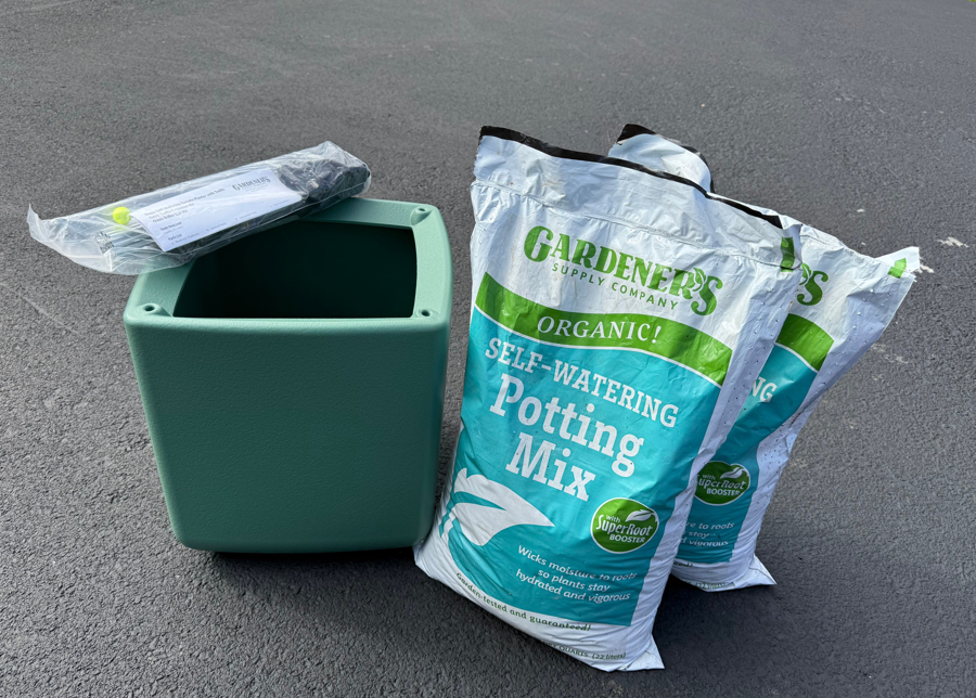 The self-watering tomato planter Oasis looks sleekly minimalist yet integrates many features — all in a conveniently compact footprint perfect for patio and balcony growing. The Oasis may be used for growing tomatoes, cucumbers, peppers, eggplant, and more. Beginners and experts alike will love this simple and fruitful system! Gardeners Supply.