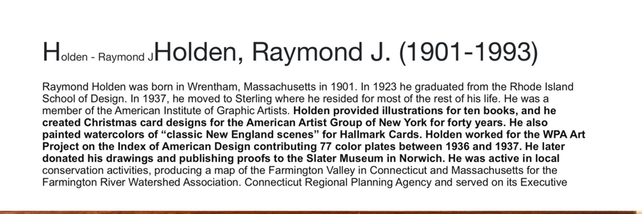 Oil Painting of a Wintry Landscape by Artist Raymond J. Holden (1901-1993) Artist information: William J. Holden graduated from the Rhode Island School of Design in 1923. He created Christmas Card designs for the American Artist Group of New York for forty years. He also painted watercolors of "classic New England scenes" for Hallmark Cards. He provided illustrations for 10 books for authors such as Henry David Thoreau. Note: On a more personal note, it was painted by a local artist whose niece was Sandy Groom's best friend.