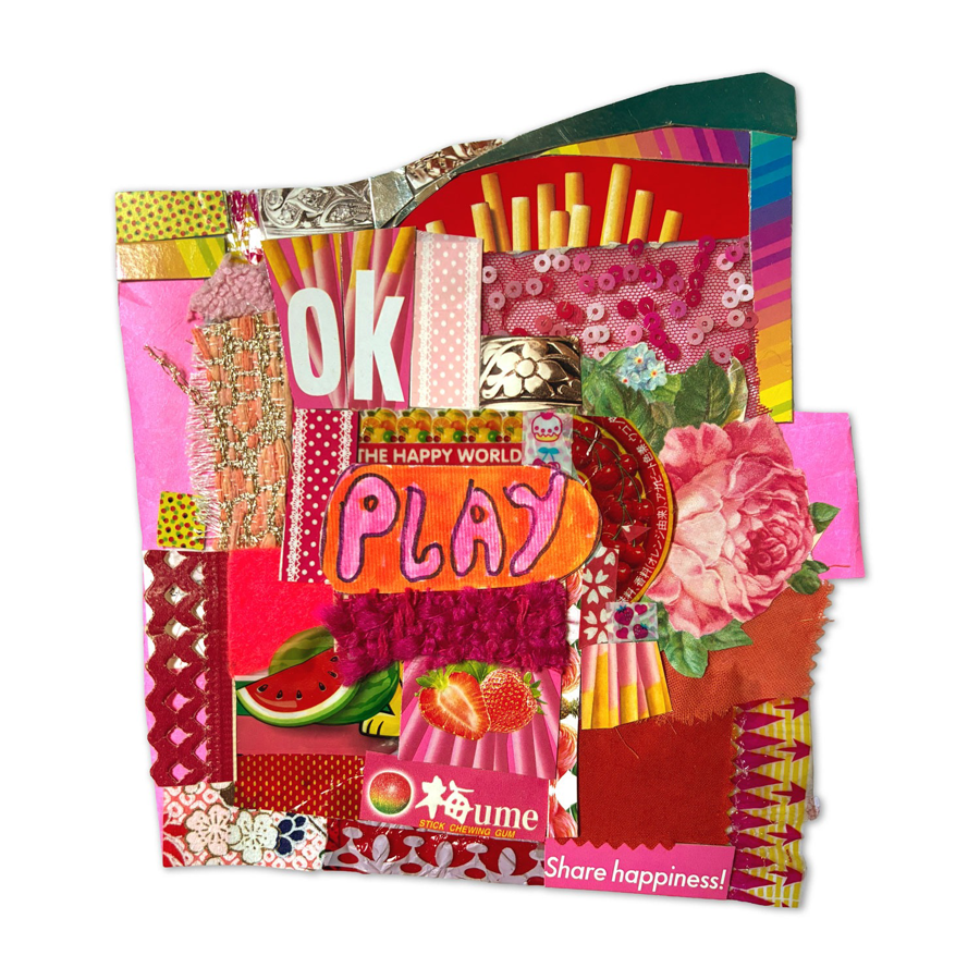 Collageoscope by Sonja Smith, created using wrappings, paper, fabric and magic tape. Playful and cheery with images evocative of summer and play. From 2025.