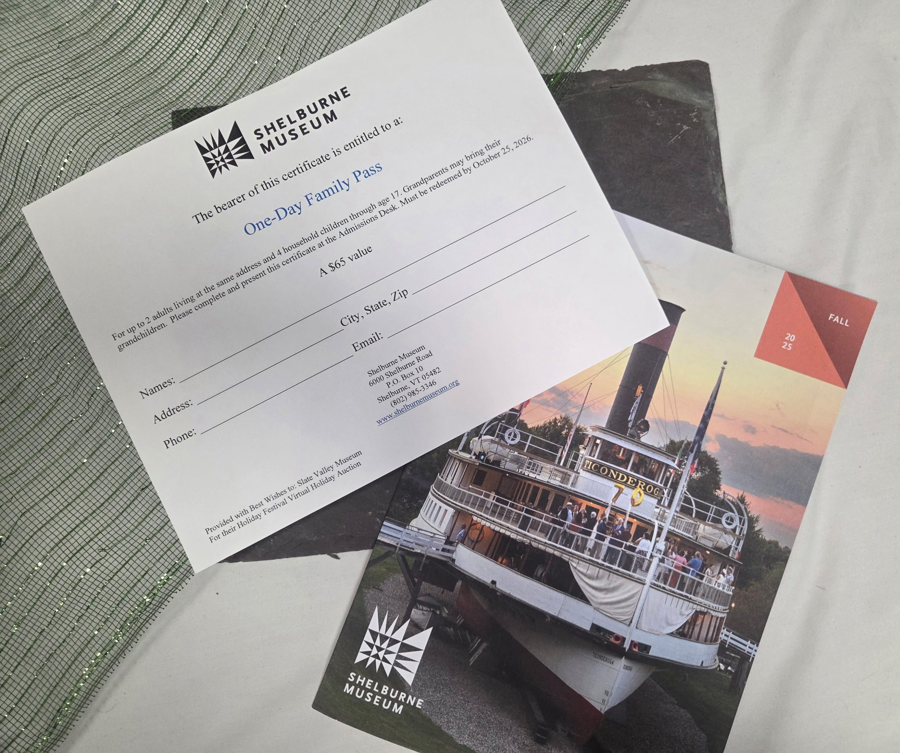 Experience a day of fun and exploration with this Family Day Pass to the Shelburne Museum. Perfect for families looking to enjoy a variety of exhibits and activities, this pass grants you access to all the wonders the museum has to offer. Discover the rich history, art, and culture displayed throughout the museum’s extensive grounds. Whether you're interested in art, history, or just a day out with loved ones, this Family Day Pass ensures a memorable experience for everyone. Don't miss your chance to create lasting memories at the Shelburne Museum! This item is available for pickup or can be shipped via USPS First Class Mail.
