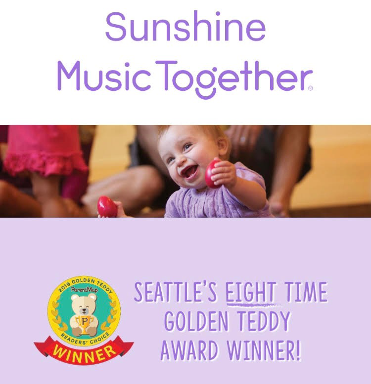 Sunshine Music Together is the eight-time ParentMap Golden Teddy Award Winner for Best Music Program in Seattle. Music Together is a research and evidence based, internationally recognized early-childhood music development program for children ages birth to five years and their parents or caregivers.The 45-minute classes include songs, rhythmic rhymes, movement, and instrument play – forty-five minutes of pure fun with your child every week! Music learning supports ALL learning!