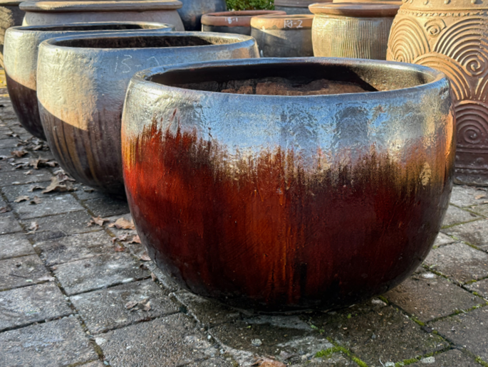 Bowl shaped, contemporary style, copper and iron glazed surface.