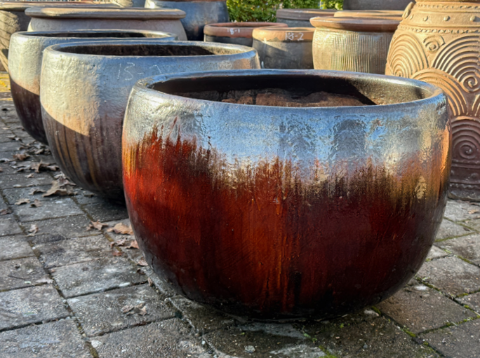 Bowl shaped, contemporary style, copper and iron glazed surface.