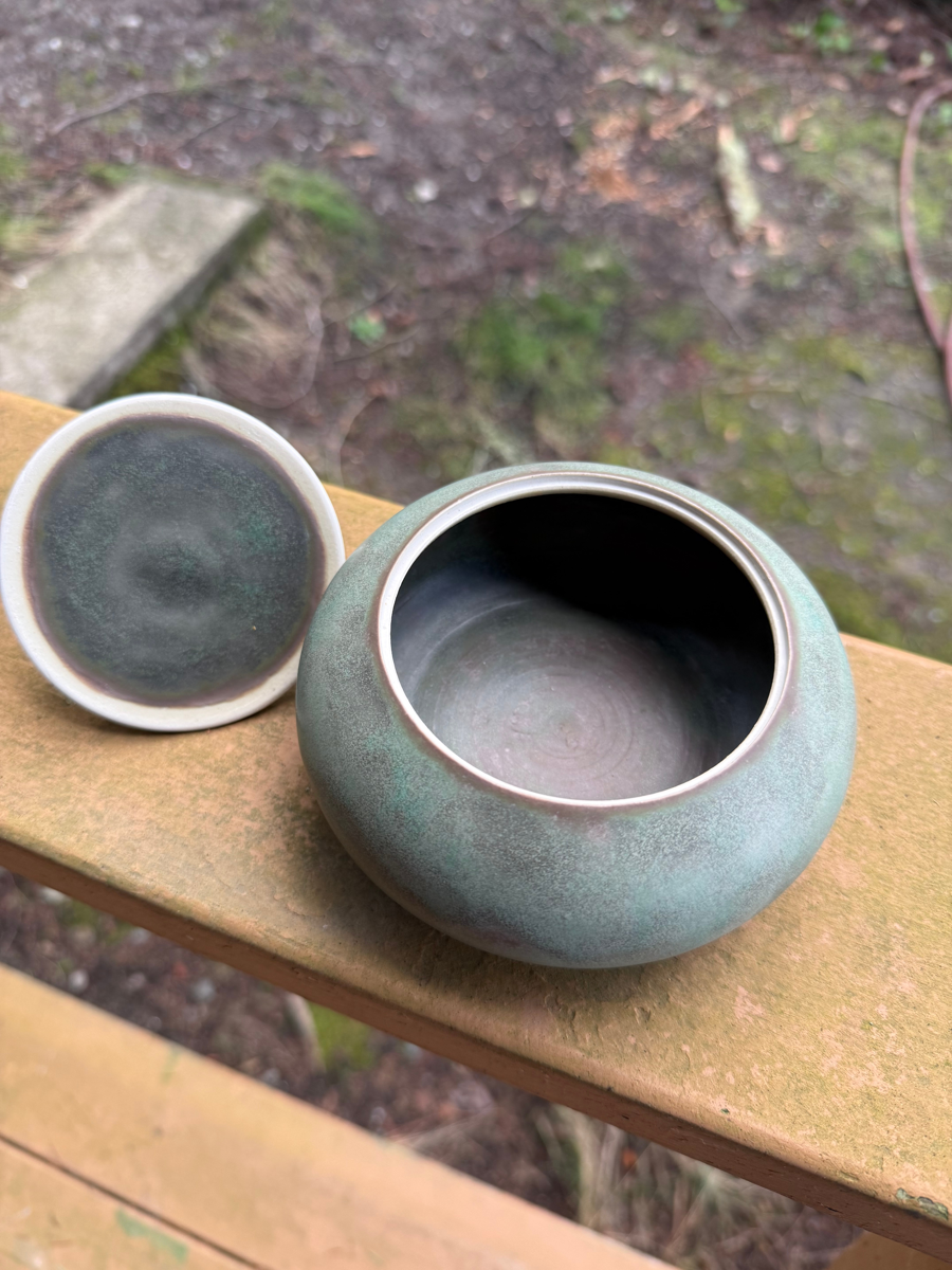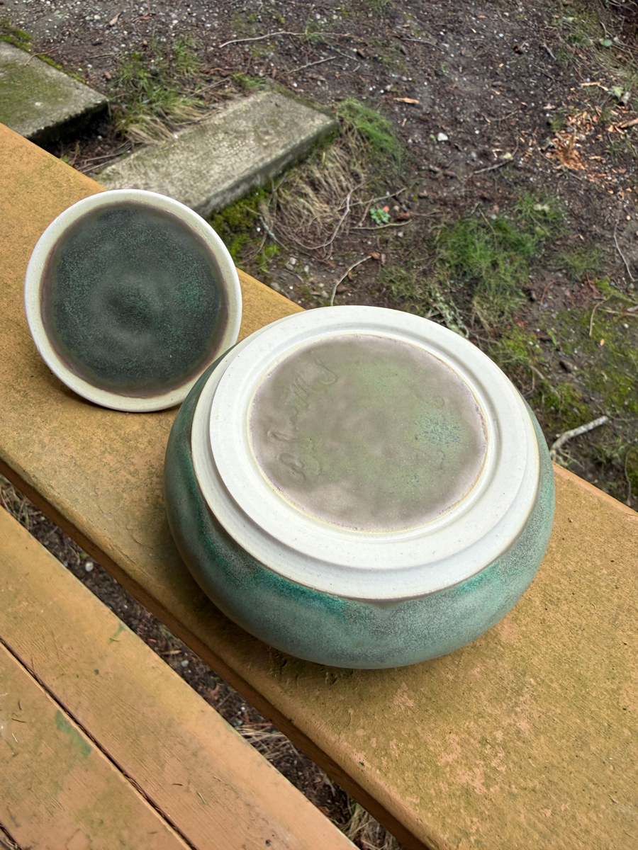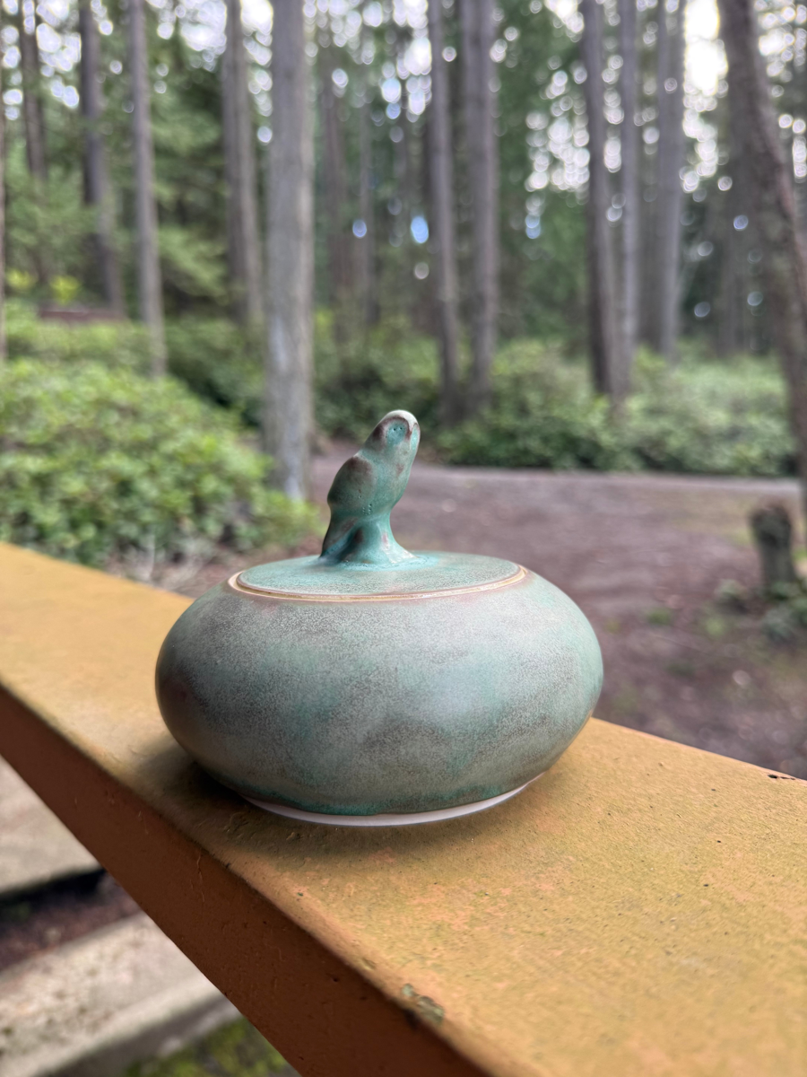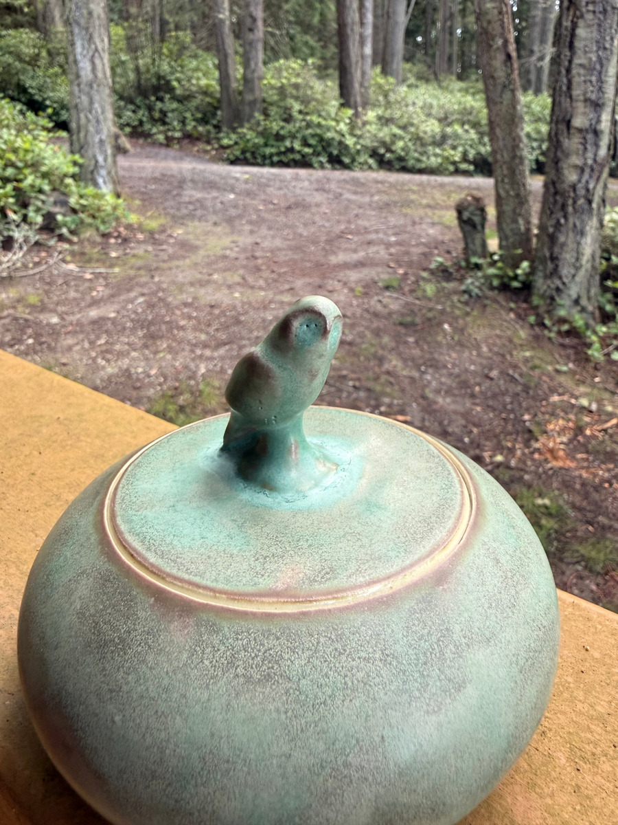 Treasure this handmade, one-of-a-kind lidded vessel adored with an owl made by directors Ben and Margaret. It measures 4.5" wide by 4.25" tall and can hold your seaglass collection from Canoe Island, your spare euros until you return to France, or your jewelry.