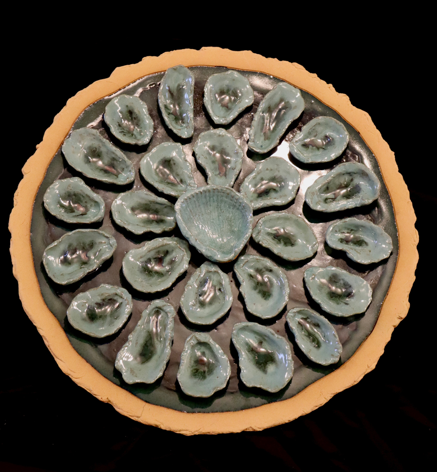 Make a statement—on the table or the wall—with this spectacular 21" handcrafted Oyster Platter / Wall Art by David Crane. Shaped like a half shell and finished in a glossy sea-glass green glaze, the piece features an array of raised, oyster-shaped forms arranged in a dramatic, sculptural pattern, with a shell detail at the center.