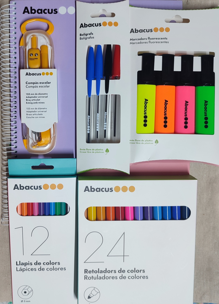 CAT Pack material escolar marca Abacus Llibreta espiral A4 de 80 fulls llisa lila, 24 retoladors de colors amb punta cònica de 5 mm, 12 llapis de colors de forma hexagonal, 4 marcadors fluorescents de colors, bolígrafs de 3 colors, compàs amb adaptador i bossa de tela Abacus. Abacus és una organització de referència en cultura, educació i cooperativisme, que crea i distribueix continguts i productes de qualitat per contribuir a un país i un món millors. https://abacus.cat/es/ EN Abacus School Supply Pack A4 spiral notebook with 80 plain lilac sheets, 24 colored markers with 5 mm conical tip, 12 hexagonal colored pencils, 4 fluorescent highlighters, 3-color pens, compass with adapter, and Abacus fabric bag. Abacus is a leading organization in culture, education, and cooperativism, creating and distributing quality content and products to contribute to a better country and a better world. https://abacus.cat/es/ ES Pack material escolar marca Abacus Libreta espiral A4 de 80 hojas lisas lilas, 24 rotuladores de colores con punta cónica de 5 mm, 12 lápices de colores de forma hexagonal, 4 marcadores fluorescentes de colores, bolígrafos de 3 colores, compás con adaptador y bolsa de tela Abacus. Abacus es una organización de referencia en cultura, educación y cooperativismo, que crea y distribuye contenidos y productos de calidad para contribuir a un país y un mundo mejores. https://abacus.cat/es/