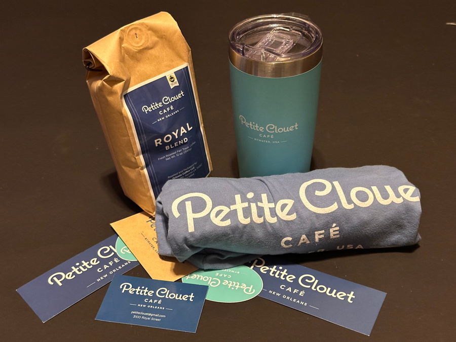 Standout package from this splendid cafe at 3100 Royal Street in the Bywater, which includes: a travel tumbler, 12oz bag of freshly roasted Royal Blend coffee beans, a Petit Clouet tee shirt, a voucher to spend at Petite Clouet and stickers and bookmarks.