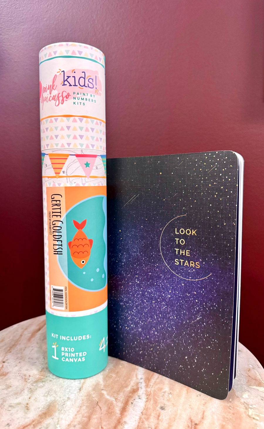 Introducing the Paint by Number Kit featuring the delightful "Gertie Goldfish" design! This creative set includes an 8x10 printed canvas that makes it easy for artists of all levels to bring this golden goldfish to life. Perfect for relaxing and unwinding, this kit comes complete with a "look to the stars" journal.