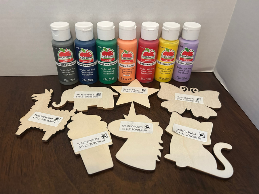 Get creative while painting these wood cutouts. - Seven (7) individual cut wood art pieces - Seven (7) 2 fluid ounce paint bottles