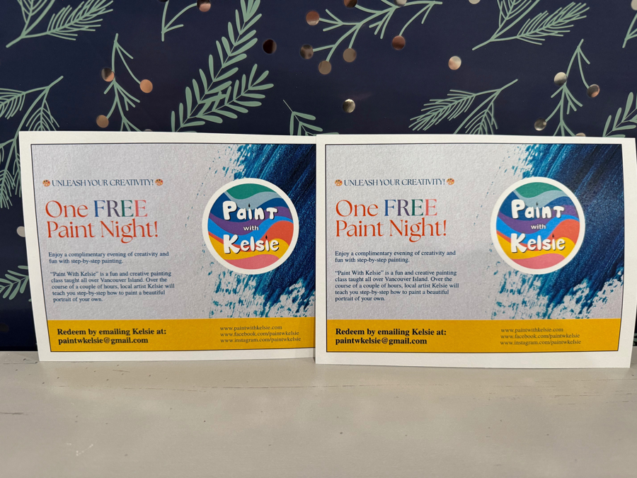 2 free passes for a fun Paint Night with Kelsie, where you can enjoy an engaging tutorial that will unleash your inner artist! With 2 free passes, you and a friend can indulge in a delightful evening filled with creativity, laughter, and great company. Hosted at local restaurants, you can eat and drink as you follow along and create your own masterpiece. Check her out on Facebook to see what she's all about! Donated by Kelsie