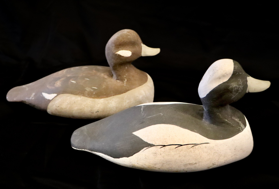 This pair of Bufflehead decoys has been hand-carved and painted by Virginia carver Jason Yost, Suffolk, VA. Representing a drake and hen, the pair captures the bold contrast and distinctive markings of this beloved diving duck.
