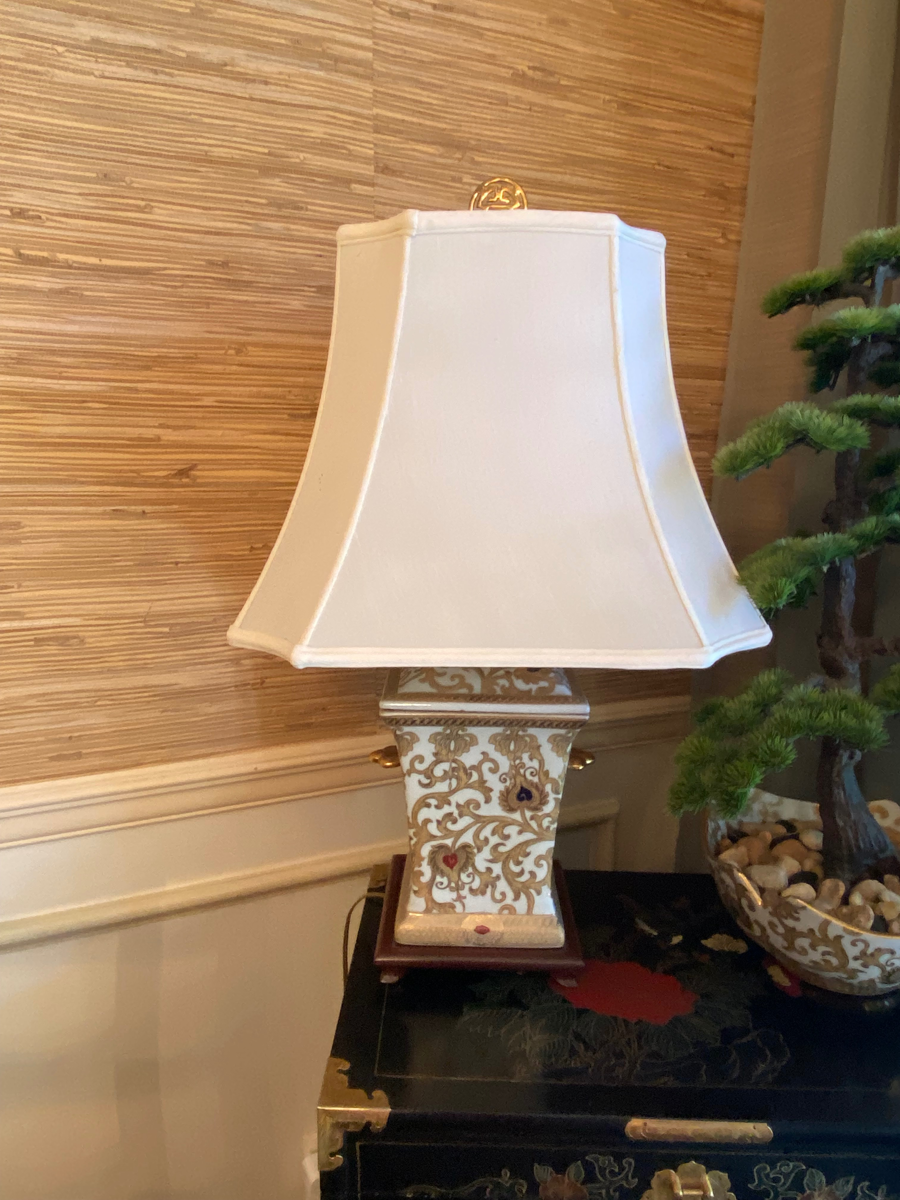 This elegant pair of 24" tall (with shades) Chinese porcelain lamps features an intricate gold scroll and floral motif accented with touches of deep red, blue, and green. Each lamp sits on a rich wooden base and is topped with a cream fabric shade and a decorative finial, adding to their refined, timeless appeal. On one of the lamps the turn switch knob needs to be replaced, but overall, they are in great condition and fully functional. The Qianlong mark on the base is a testament to its authenticity and historical significance, making this a truly unique and valuable addition to any collection.