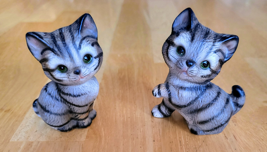 Vintage Harvey Knox Kingdom Ceramic Tabby Cat Figurines. Their eyes suggest that they want to play! Made in Japan, each measures about 2" tall.