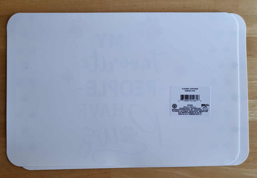 PURRfect for a pet food area or outdoor table, cleanup will be a breeze with these vinyl placemats. Pet collar image dangles from the final "S" in Paws. Each measures about 11.25" x 17".