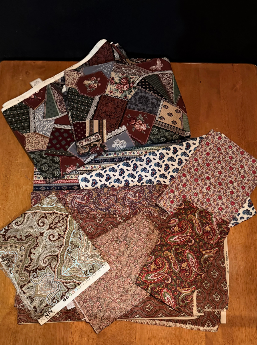 Paisley 1 (9 different fabrics including a 6 yard piece) Multiple pieces of fabric. No guarantees for sizes (all sizes are estimates)