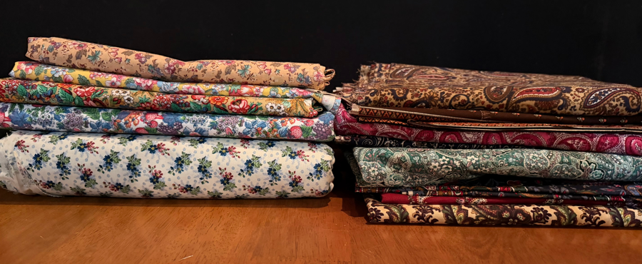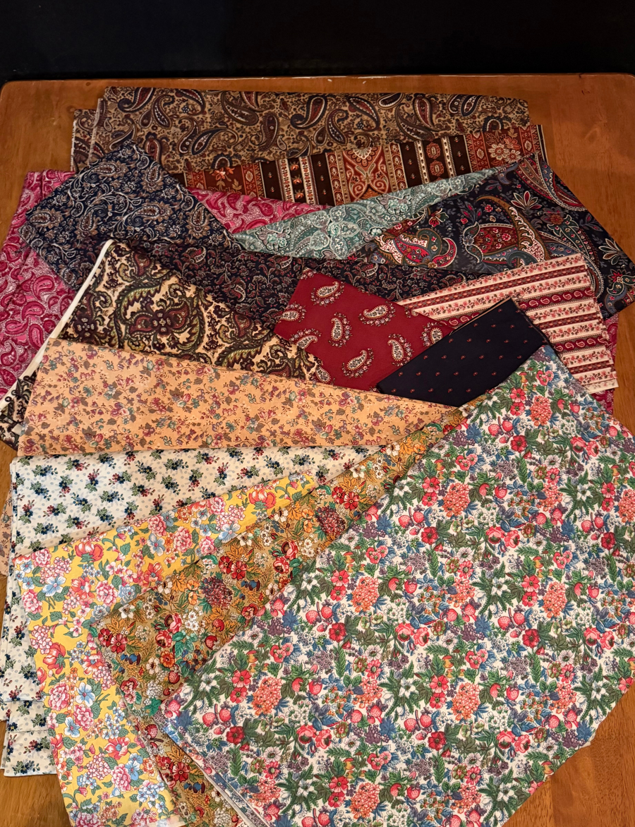 Paisley & Flower (16 different fabrics including 8 yard piece) Multiple pieces of fabric. No guarantees for sizes (all sizes are estimates)