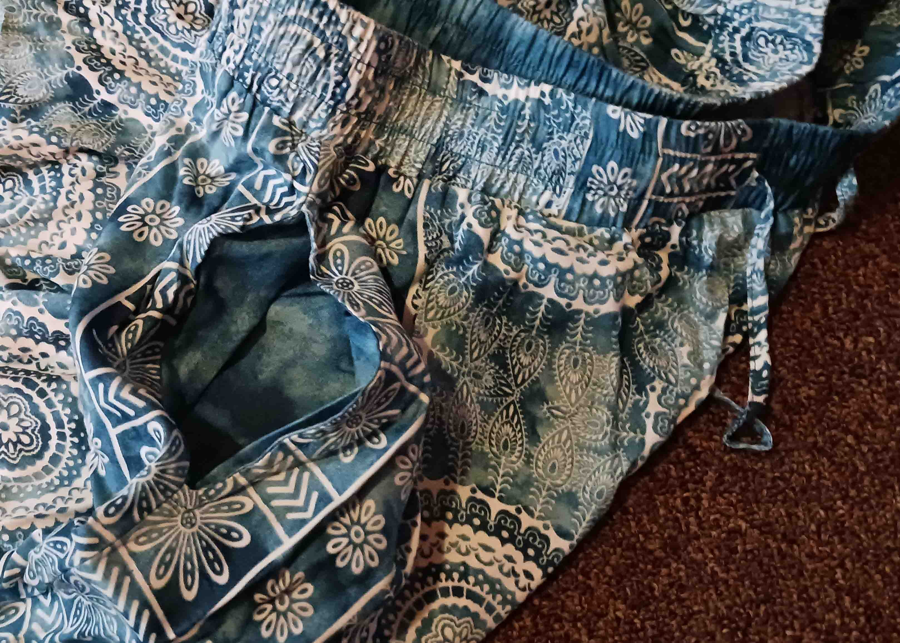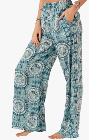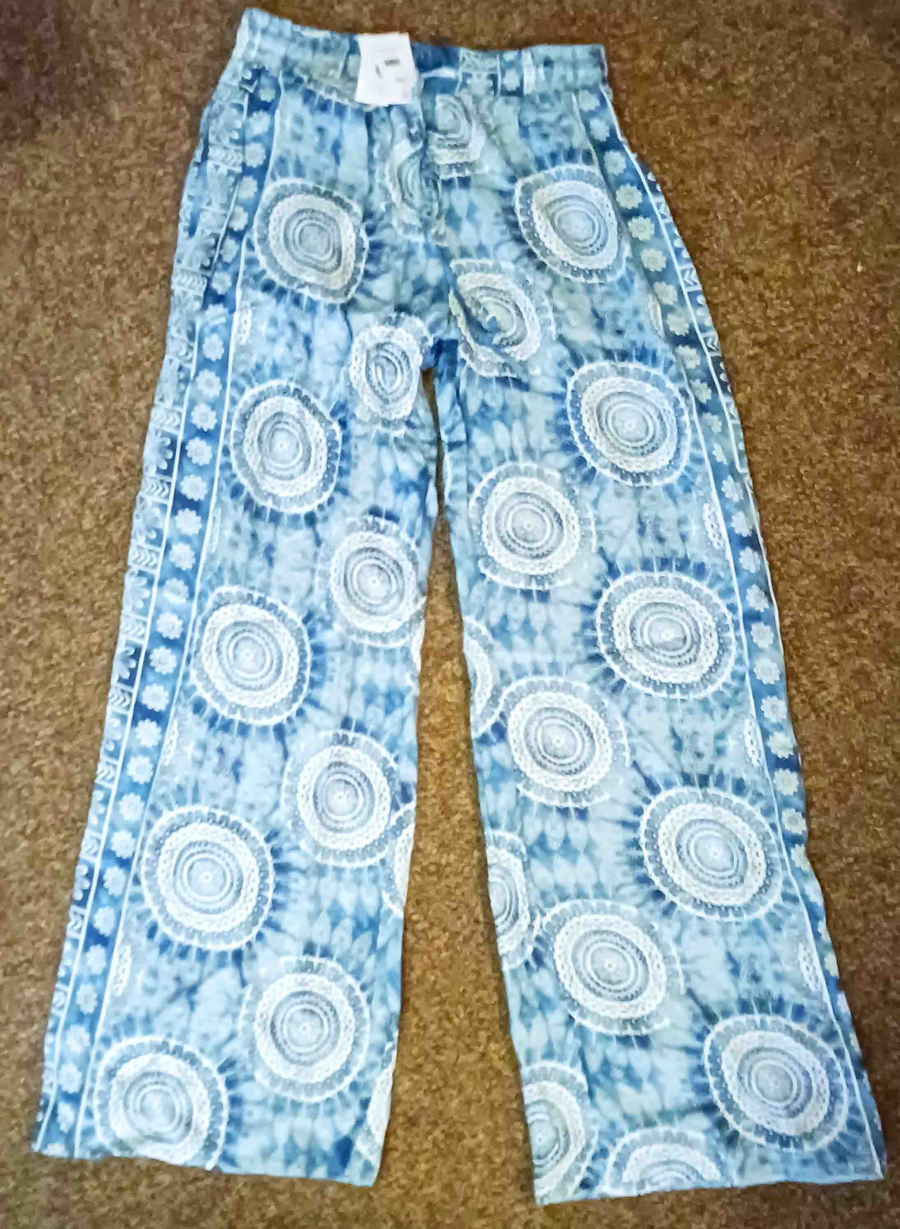These Lotus and Luna Palmetto Point Wide Leg Drawstring Pants have an ultra-soft and lightweight feel. Featuring a relaxed fit with a mid-rise elastic drawstring waist and convenient front pockets, these pants are perfect for the beach or a lazy lounge day! Wide leg, with pockets. Drawstring adjustable elastic waist. 100% Breathable Rayon Ladies Medium size - very adjustable Colour is true to the first 3 images.
