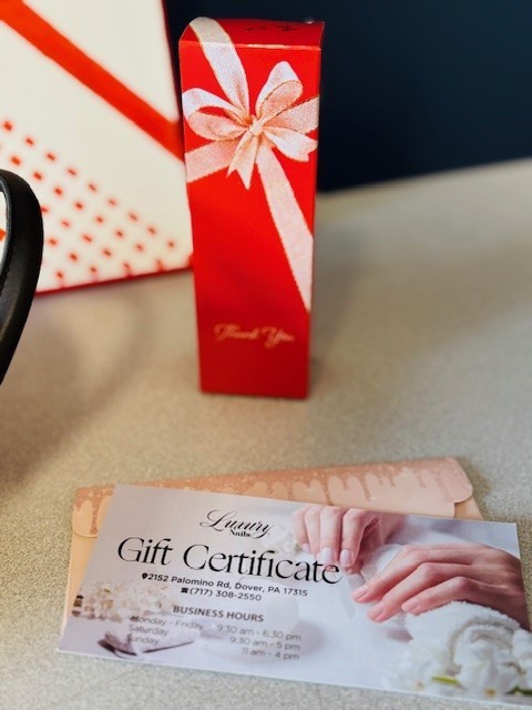 Included in this package is a $50 gift card to Luxury Nails in Dover (2152 Palomino Rd., Dover, PA), and Pomegranate hand and body lotion, too! (https://www.facebook.com/Luxurynailsdoverpa/)