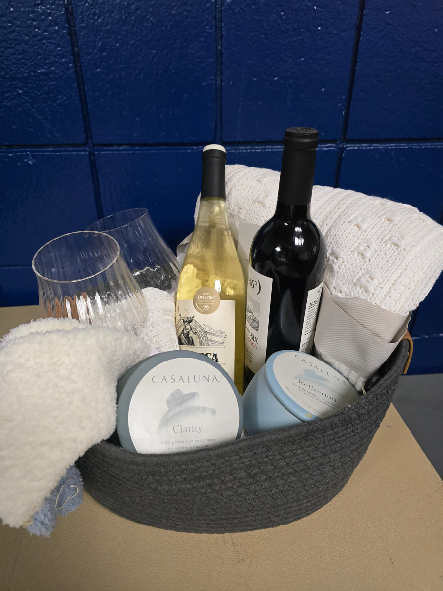 Pampering yourself is easy with this timeless slate gray woven rope basket containing a woven cream throw blanket, two fluted wine glasses, cozy fuzzy socks, two scented candles to bring reflection and clarity to your life and two award winning bottles of wine — a Spanish 2024 Albariño and a Washington State 2021 Cabernet Sauvignon.