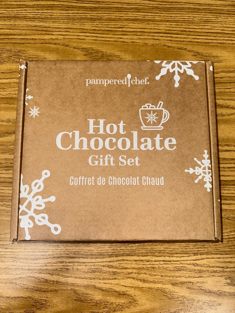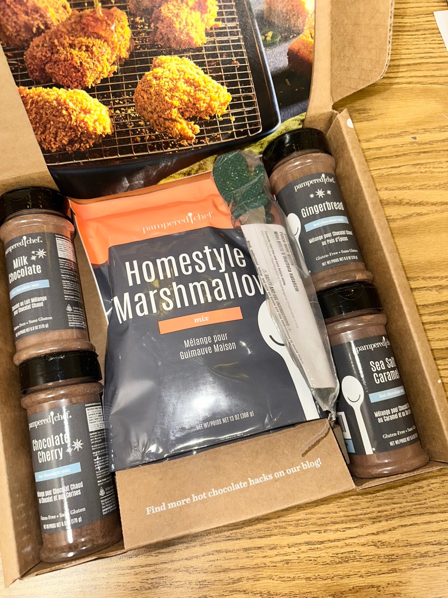This amaazing Pampered Chef giftset includes: Marshmallow Mix, Mitten Tongs, 4 Hot Chocolate mixes (milk chocolate, chocolate cherry, gingerbread, and sea salt caramel)
