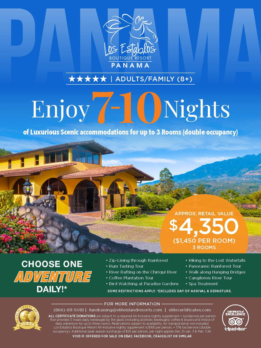 ADVENTURE CHOOSE ONE DAILY!* Zip-Lining through Rainforest • Rum Tasting Tour • River Rafting on the Chiriquí River • Coffee Plantation Tour • Bird Watching at Paradise Gardens • Hiking to the Lost Waterfalls • Panoramic Rainforest Tour • Walk along Hanging Bridges • Cangilones River Tour • Spa Treatment SOME RESTRICTIONS APPLY. *EXCLUDES DAY OF ARRIVAL & DEPARTURE. APPROX. RETAIL VALUE $4,350 ($1,450 PER ROOM) 3 ROOMS ALL CERTIFICATE DONATIONS are subject to a required All-Inclusive nightly supplement + tax/service per person that provides 3 meals daily, beverages by the glass (including alcoholic beverages) coffee & snacks and choice of daily adventure for up to three rooms. Reservations subject to availability. Air transportation not included. Los Establos Boutique Resort All-Inclusive nightly supplement is $165 per person, + 17% tax/service (double occupancy). Additional peak season surcharge of $25 per person, per night applies Dec 21-Jan. 3 & Feb. 1-24.