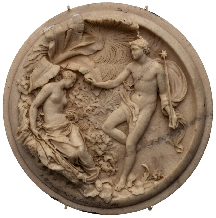 The fractious yet enduring love of Oberon and Titania, first immortalized in William Shakespeare's A Midsummer Night's Dream, became a popular motif during the Victorian era. This beautiful reproduction of an 1841 sculpture by E. W. Wyon (a sculptor and scion of the Wyon family of medallists and engravers) depicts the king and queen of fairyland in parian marble. 7.5" in diameter. * Following the auction, winners will receive an invoice for their winning bid and shipping costs.