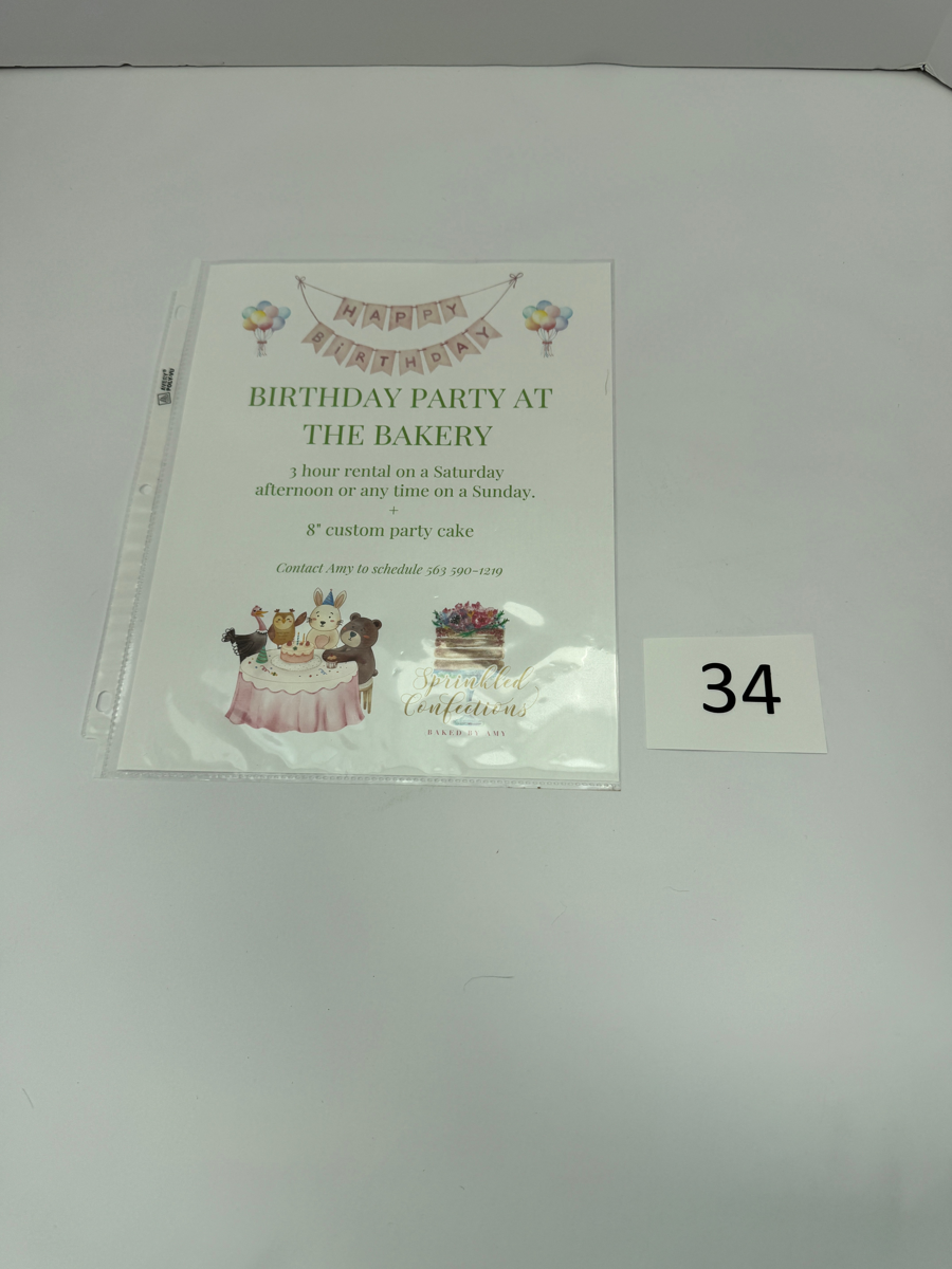 birthday party at the bakery-3 hour rental on a Saturday afternoon or Sunday and an 8" custom party cake