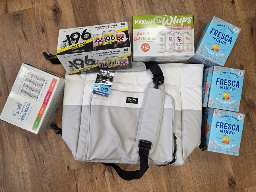 Pack your seltzers in you Igloo cooler bag (holds 36 cans) to...the beach, tailgating at your favorite game, or where you land. To go package includes: Igloo cooler bag - holds 36 cans Three 4pk of Fresca Mixed Grapefruit Citrus Vodka Spritz 8pk of Smooth Water Fruit Infused Vodka Water variety pack 8pk of -196 Vodka Seltzers variety pack 8pk of Margarita Whips Fruit Tequila variety pack
