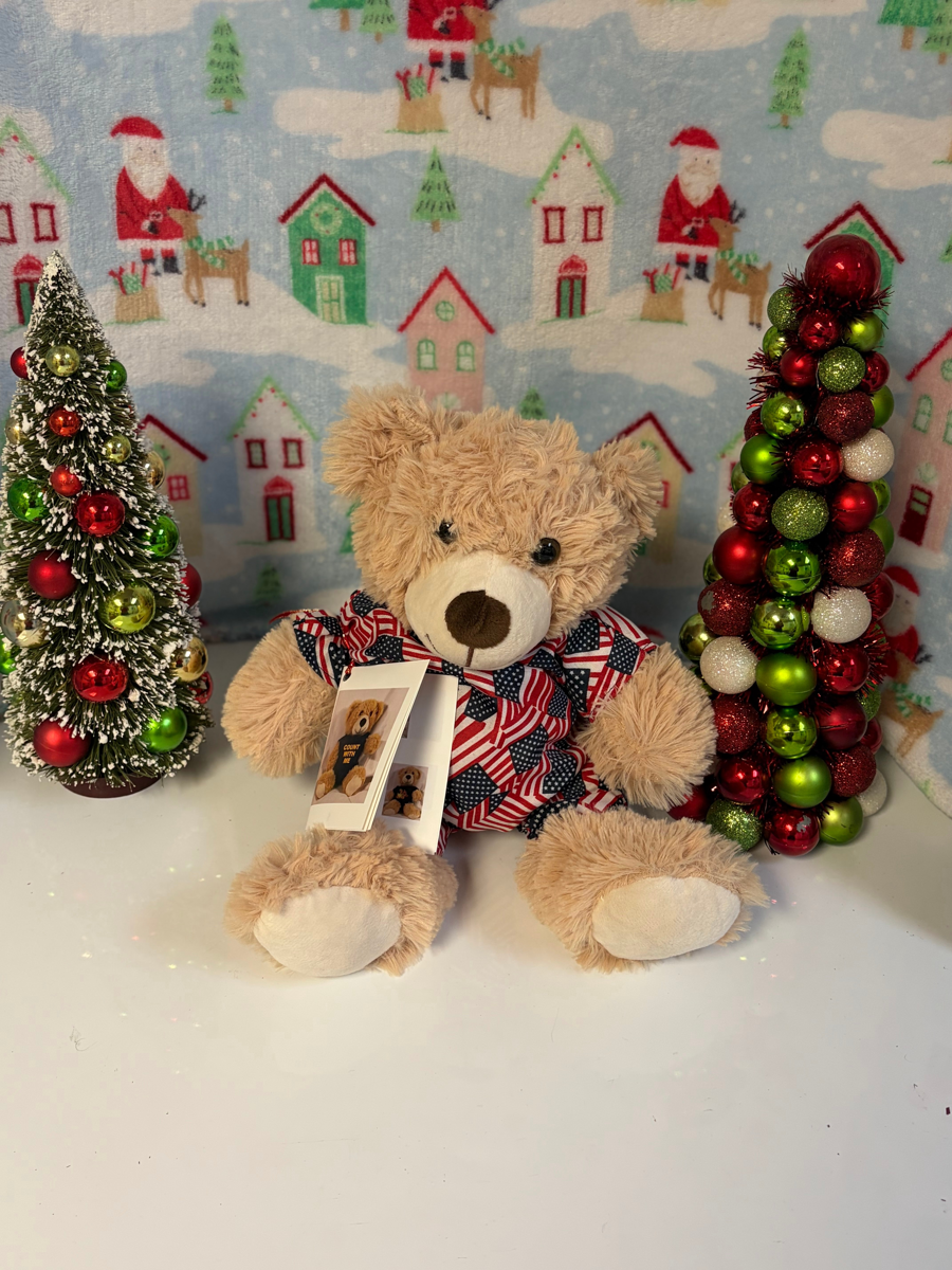 Patriot Paws Parker is a lovingly handcrafted bear dressed in a bold and festive shirt bursting with bright American flags. With his soft tan fur, warm smile, and cheerful spirit, Parker is the perfect companion for little ones who love celebration, color, and adventure. His outfit makes him stand out — a tiny hero ready to spread joy at holidays, parades, picnics, and cozy nights at home. Parker proudly carries his How to Count book, excited to help his new friend learn numbers with confidence and fun. Whether he’s watching fireworks in pretend play, sitting beneath the Christmas tree adding a pop of red, white, and blue, or offering comfort during story time, Patriot Paws Parker brings pride, happiness, and heart wherever he goes. Handmade with care, filled with spirit — Parker is ready to meet his forever friend.