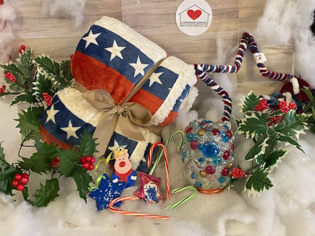 A comfy, snuggly, soft, Americana blanket to keep you toasty and warm. 3 Ben's Place patriotic ornaments, a night light, and a star shaped wreath by Ben's Place members,