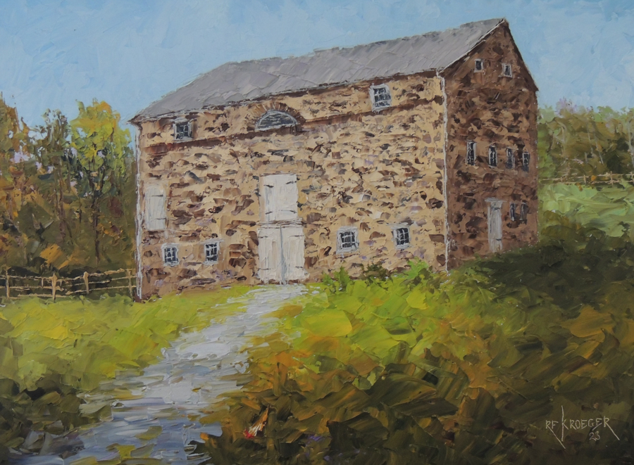 Mercer County, NJ. 10x14". It's appropriate that this farmstead and its striking stone barn are located in Mercer County, which is named for Brigadier General Hugh Mercer, a surgeon who not only died in the Battle of Princeton in 1777 and served with George Washington in the French and Indian War but also fought with the Jacobites at the Battle of Culloden in Scotland in 1746. Barn, built in the 1830s, features the tale of Commodore John Stockton and his effort to rescue soldiers surrounded in the Mexican War in California. This painting can be seen at the Hocking County Historical Society, Logan, Ohio. Call 740 385-6026 (office number) or 740 603-1876 with questions.