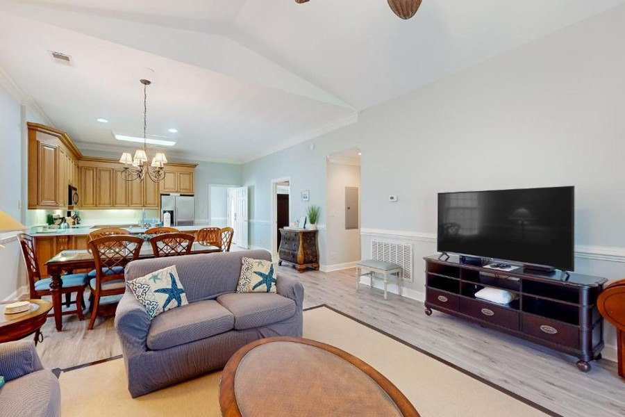 Gather up all your family and friends and head down to South Carolina for a one week vacation in 2026. This fully equipped condominium sleeps up to 10 people. There are 4 bedrooms, 3 bathrooms, and a beautiful screened porch. This large unit is an ideal set-up for vacationing with extended family or a group of friends. There are two distinct living areas off the entry foyer. One area has two bedrooms, two baths and the primary living room and kitchen. The second area has two bedrooms, one bath and a kitchenette. The complex has a pool and tennis courts and is only two miles from the beach. Lots of shopping, golf and restaurants nearby. This is a second floor unit and there is no elevator. Winning bidder to arrange mutually agreeable dates with the Martins. Visit www.vacasa.com/unit/109450