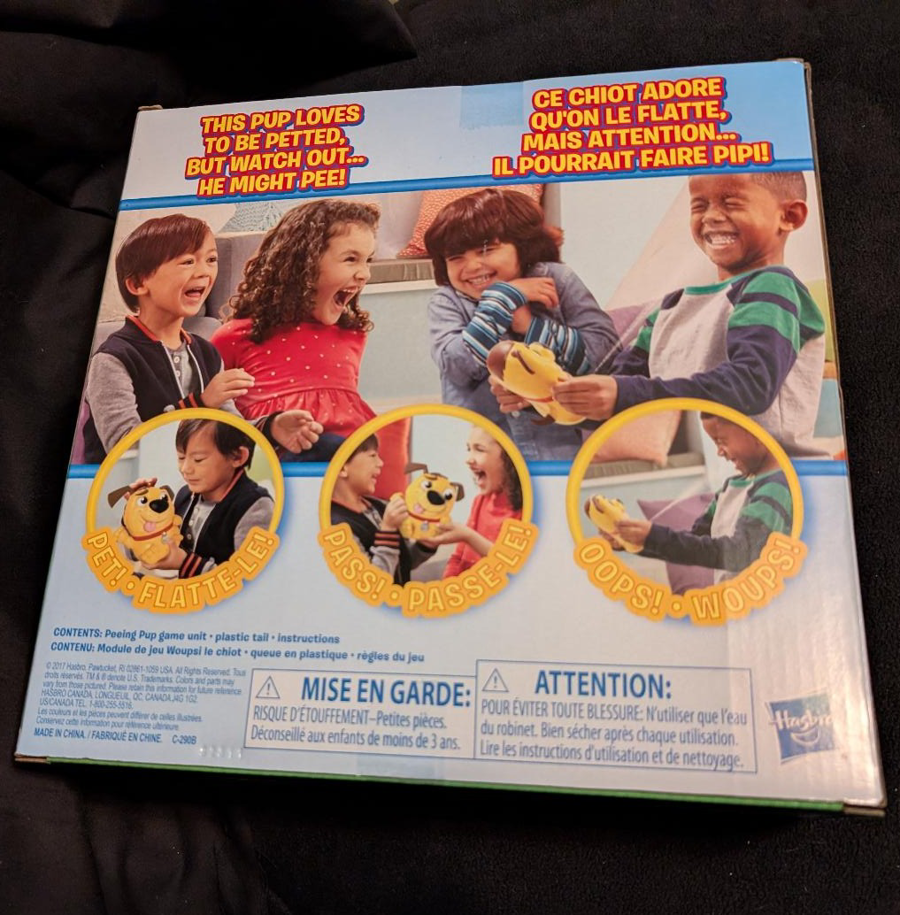 Pass the Pup: the suspense builds as players pass the puppy in this "Hot potato" Game Cute get-wet pet: players take turns holding the Pup, Petting him until he barks 3 times. Then it's time to pass the Pup around, but watch out! Someone will get sprayed while holding him Stay dry to win: the only player who doesn't get peed on by the Pup wins the game Easy and fun kids' Game: This hilarious and unpredictable kids' Game is easy to play and can generate lots of laughs. It makes a great indoor activity to play with preschoolers ages 4 and up