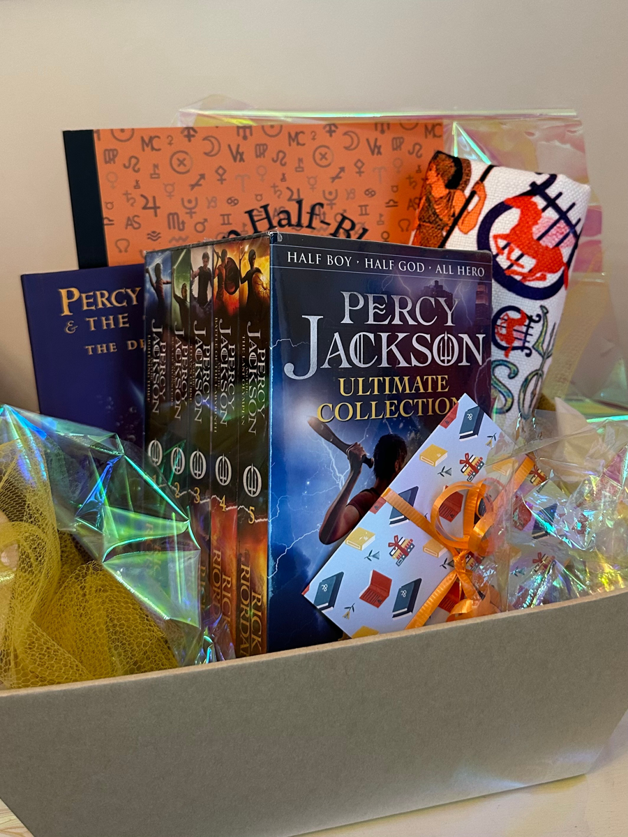 This Percy Jackson themed basket includes a $120 Barnes and Noble Gift Card, Box set of the Percy Jackson Series, The Demigod Files, a PJ canvas tote and lined notebook.