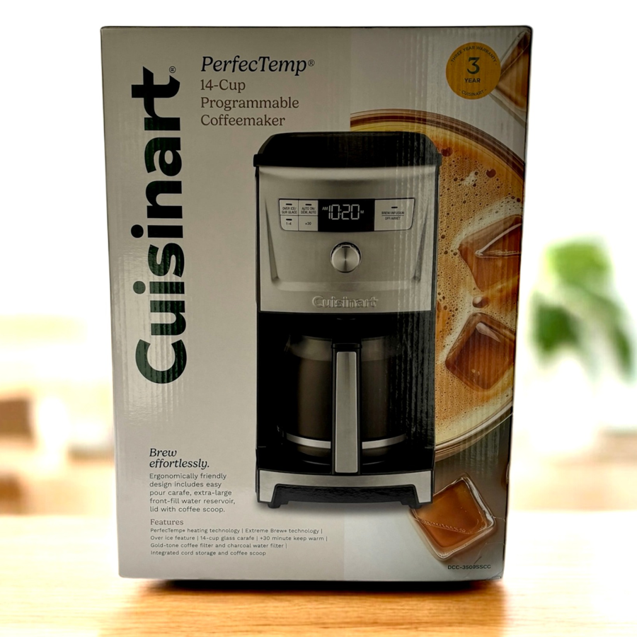 Brew fresh, full-flavored coffee hotter and faster with the innovative PerfecTemp® 14-Cup Programmable Coffeemaker. PerfecTemp heating technology ensures you always get piping-hot coffee with less waiting and without sacrificing flavor. Customize your coffee experience with 1-4 cup settings and adjustable 24-hour start and auto-shut-off times. Extend the Keep Warm function for an extra 30 minutes to maintain the perfect temperature for up to 4 hours. The charcoal and gold-tone filters work together to produce the fullest, freshest flavor, and the over ice function gives you the option to enjoy refreshing iced coffee at the touch of a button. Simple to use, with an intuitive control panel, front-fill water reservoir, and easy-pour carafe, this coffeemaker makes brewing your best coffee easy.