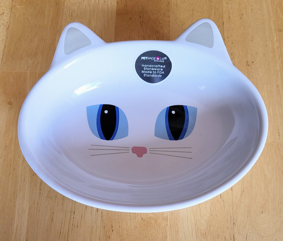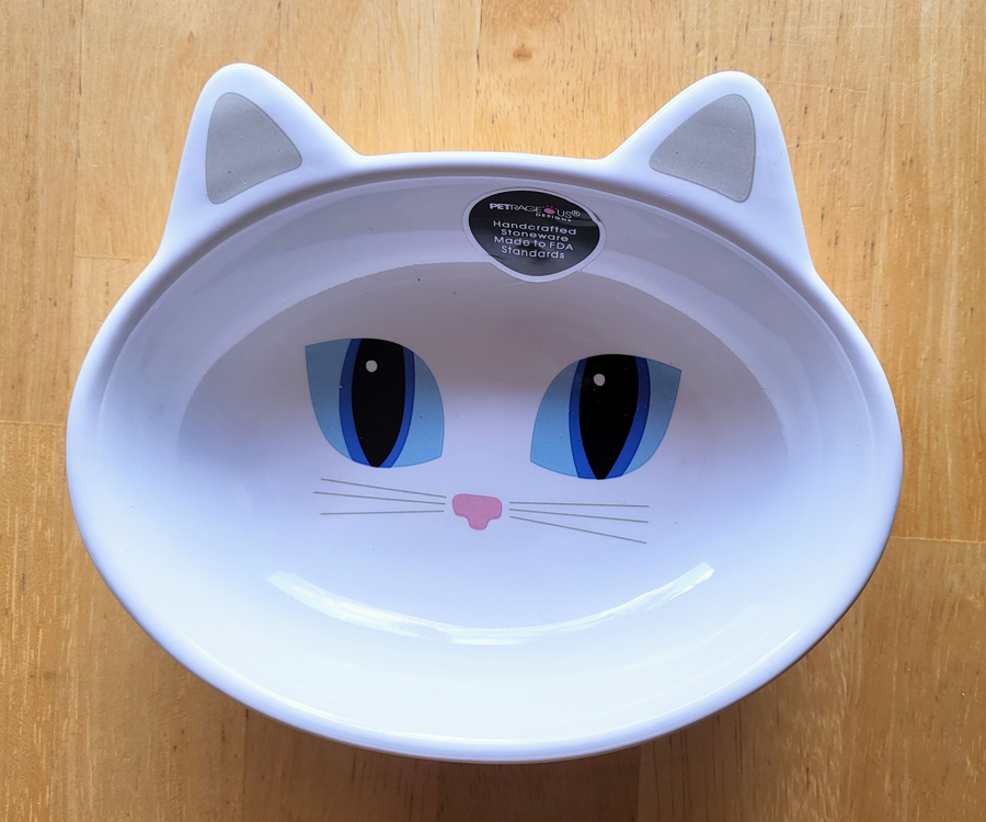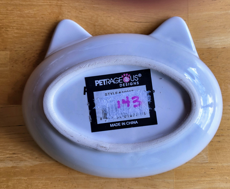 This dish with a big-eyed kitty face, little pink nose, and perky ears is adorable! Measures about 5.5" x 4" x 1" deep.