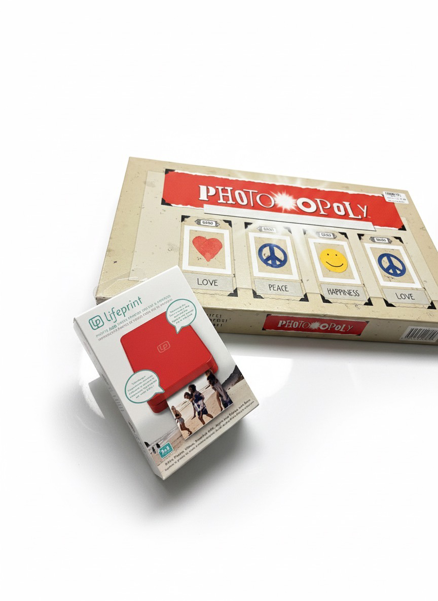 Photo themed Monopoly game. Add your own pictures to completely personalize this fun game. Great for gift giving this holiday season! Lifeprint 2x3 mini photo printer. Ink free mini printer connects to an iPhone or Android with an easy to use app. Making printing your own photos easy! Value: $115 *Can be shipped or picked up at the walk*