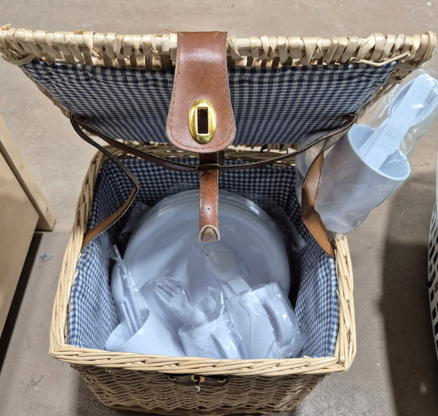 Picnic Basket 11"x 11"x12". Leather latch and handle. Blue checked interior with heavy plastic dinnerware for 4 people. Very nice basket.