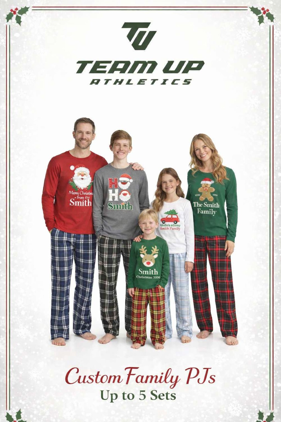 Whether it's a holiday or other occasion, matching pajamas make for a perfect family photo! Team Up Athletics will work with you to make custom family pajamas, up to 5 sets. Each family member will get a pair of soft, comfy plaid pajama pants and you will get to help design the pajama top. Prepare to be the cutest family around!