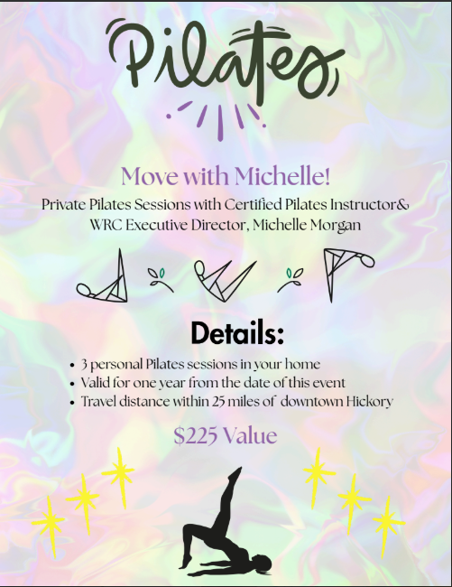 Private pilates sessions with Certified Pilates Instructor & WRC Executive Director Michelle Morgan. 3 personal session in your home (within 24 miles of downtown Hickory)