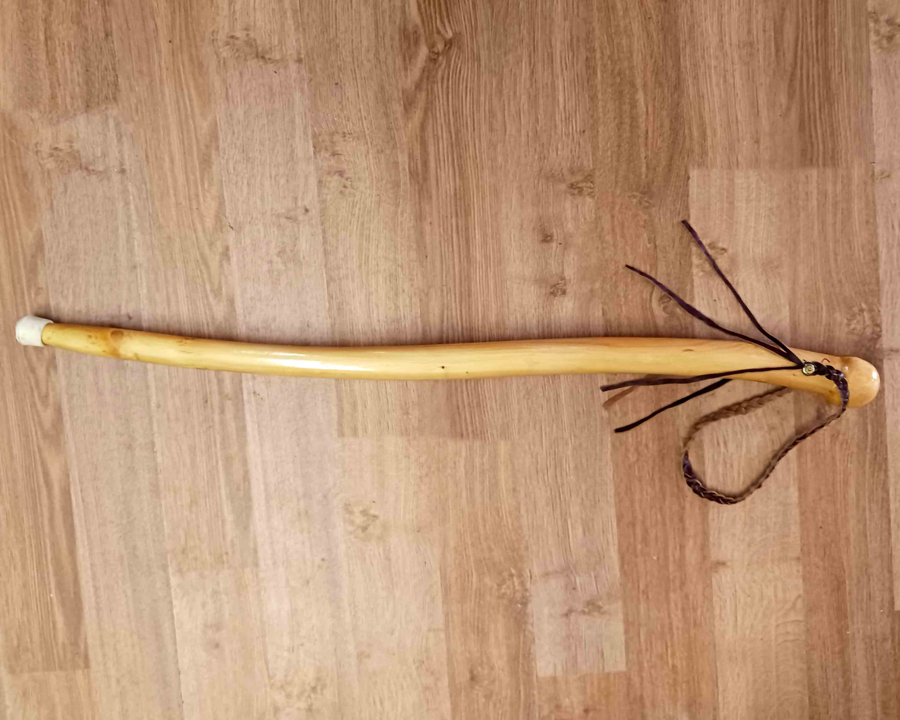 This handmade wooden walking stick is 88 cm tall and has a comfortable knob at the top that nicely fits into your hand. It's lightweight, varnished and smooth as silk. The leather hand strap and rubber stopper knob at the base ensure good grip and stability.