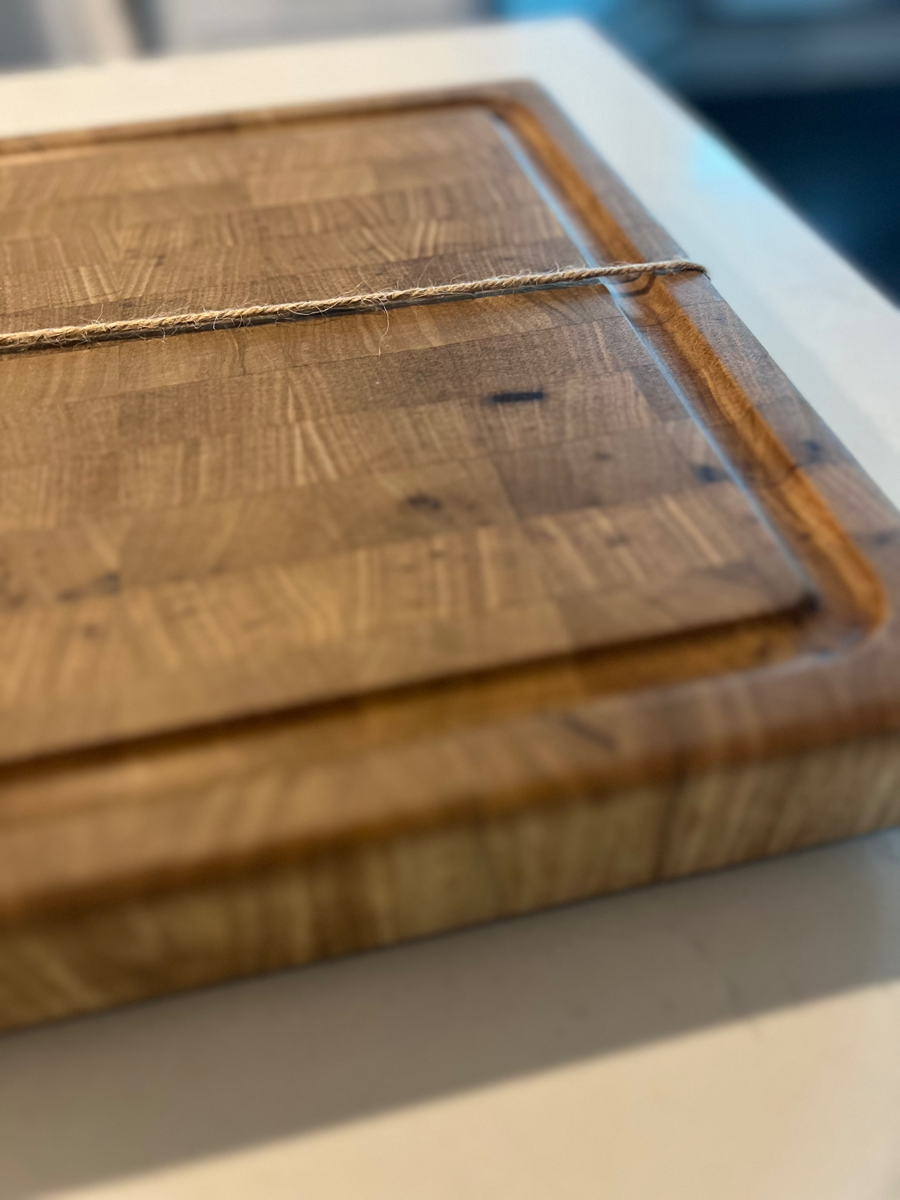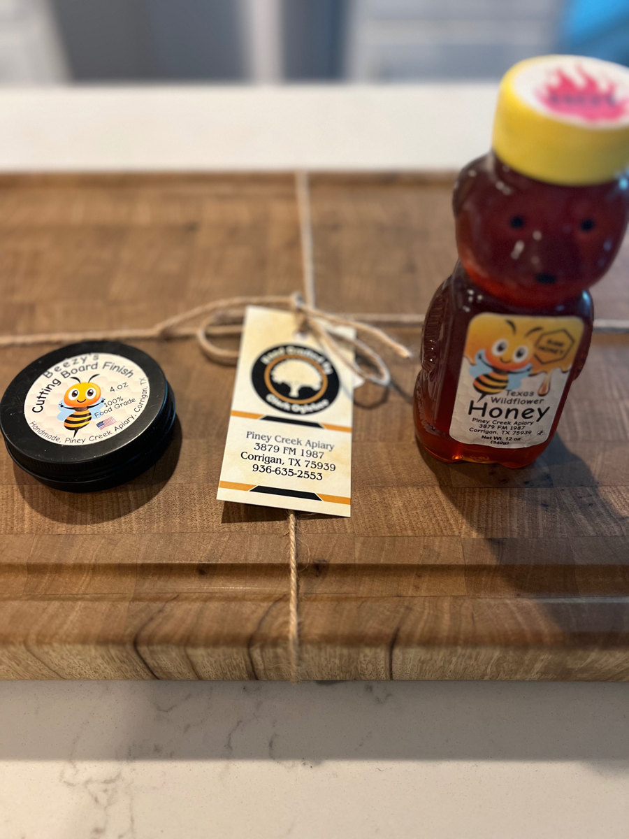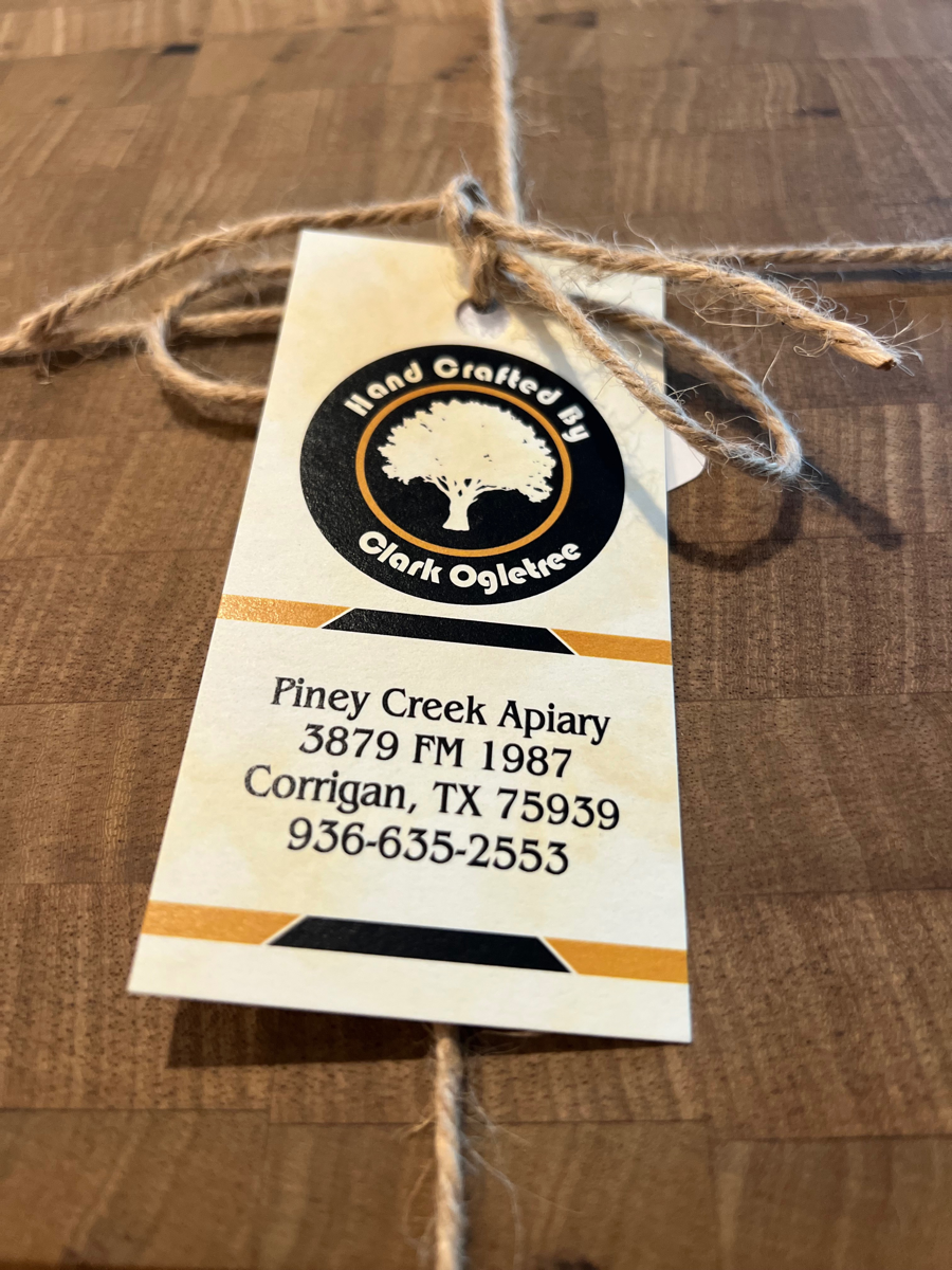 Piney Creek Apiary and Woodworking The board is African Black Limba, end grain (21x12.5x1.75) Also includes one bottle of board care wax and one bottle of Piney Creek Apiary and Woodworking homemade East Texas hot honey. Retail Value: $350