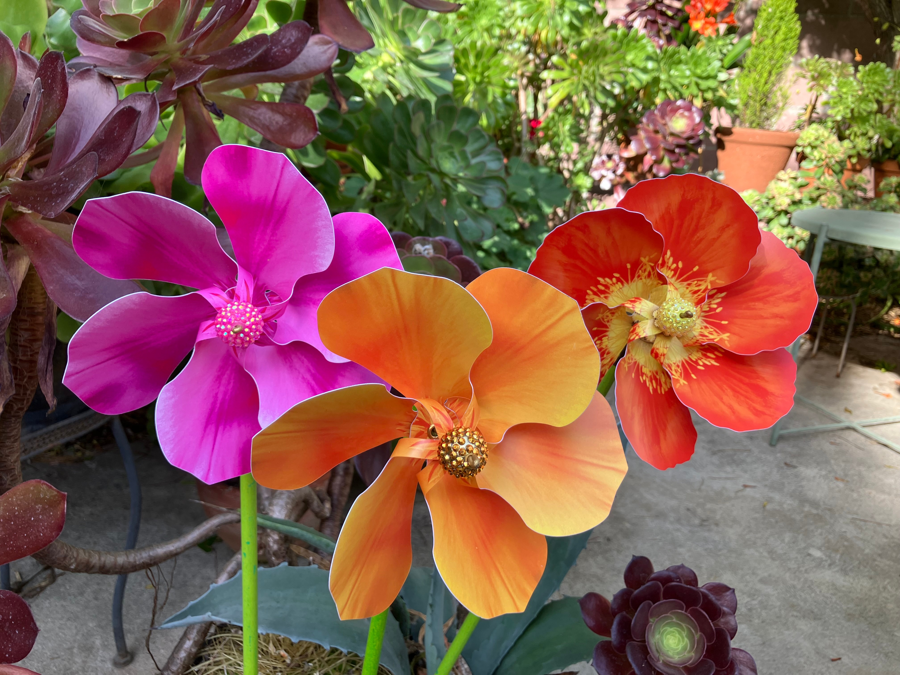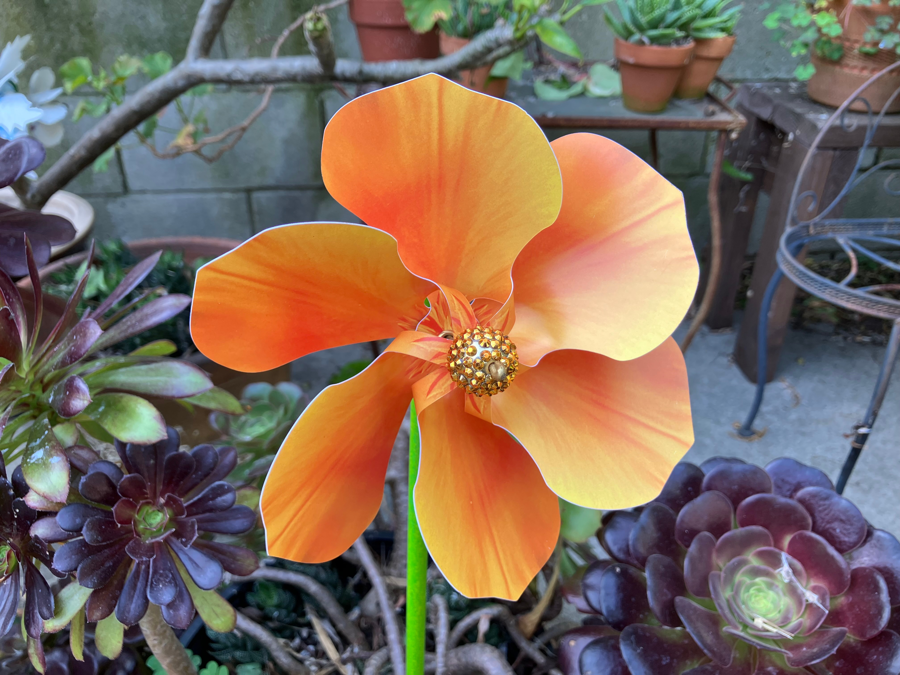 Make a statement with this stunning collection of smaller pinwheels that make up a beautiful and colorful bouquet. The sticks are of different heights so the pinwheels can spread out and bring joy to a room. There are three (3) pinwheels in this set of iconic California Poppies: California poppy, fire poppy and pink poppy. Created and constructed by artist Jerolyn Crute who founded Paper Arboretum. Paper Arboretum puts a literal spin on garden decor! Jerolyn creates uniquely designed; hand-assembled waterproof pinwheels inspired by nature.