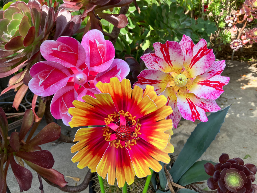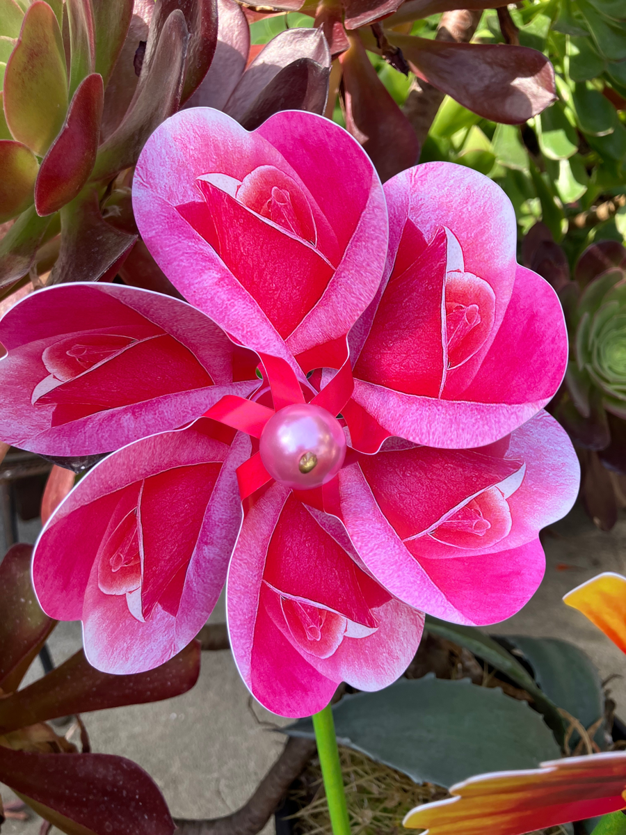 Make a statement with this stunning collection of smaller pinwheels that make up a beautiful and colorful bouquet. The sticks are of different heights so the pinwheels can spread out and bring joy to a room. There are three (3) pinwheels in this set of rose themed pinwheels: Pink rose, blanket flower and striped rose. Created and constructed by artist Jerolyn Crute who founded Paper Arboretum. Paper Arboretum puts a literal spin on garden decor! Jerolyn creates uniquely designed; hand-assembled waterproof pinwheels inspired by nature.